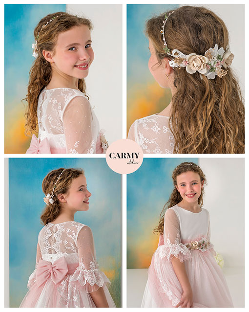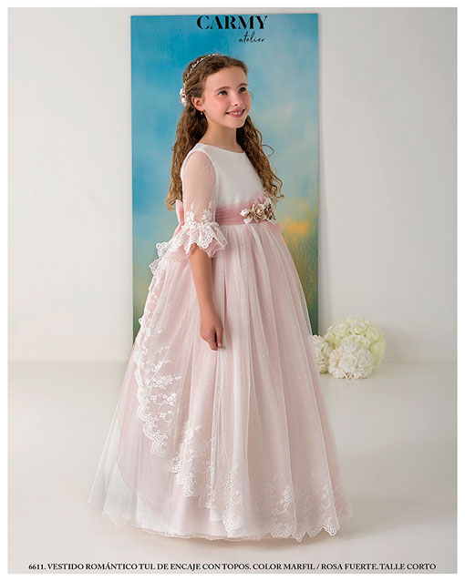 Este vestido de comunión combina elegancia y dulzura con su diseño en tul bordado color marfil, complementado con detalles en tul rosa. Su cuerpo con espalda bordada transparente resalta la delicadeza, mientras que las mangas largas al codo con volante bordado aportan sofisticación. La falda bordada, con tul rosa debajo y una abertura en la espalda, se complementa con un cinturón de tul rosa.