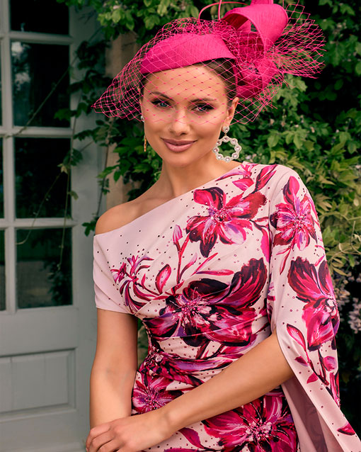 Vestido realizado en crepe rosa, con alegre estampación y pequeños cristales de color de la flor, además su precioso bordado le aporta elegancia y distinción a este vestido que sienta espectacular.