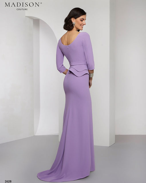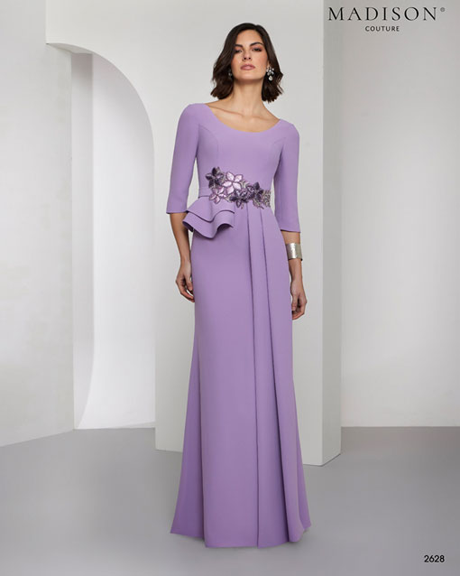Vestido en creppé con manga francesa con original peplum y precioso bordado al tono, en el talle.