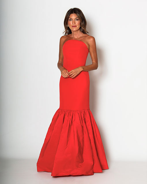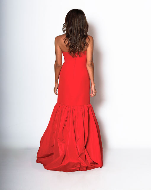 Vestido en  palabra de honor confeccionado creppe muy adaptable con corte en la rodilla con original volumen en tafettan.