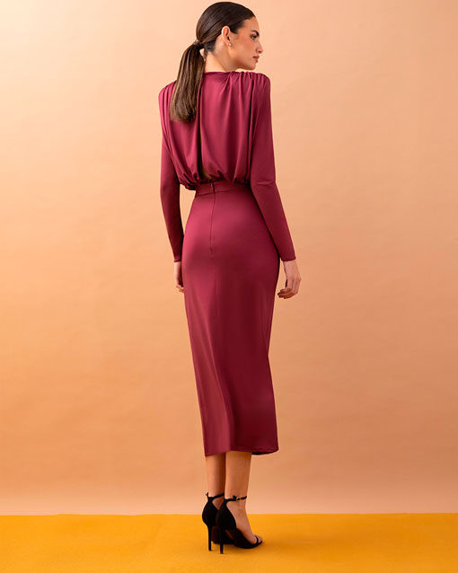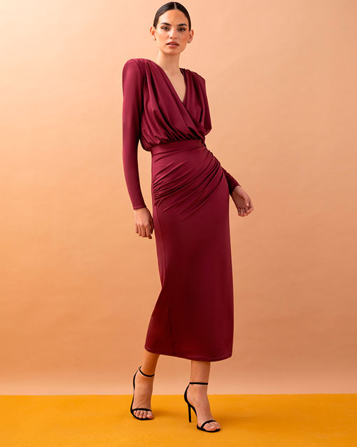 Body ablusado de punto con manga larga y hombros marcados. Cuerpo drapeado que cruza en el delantero.