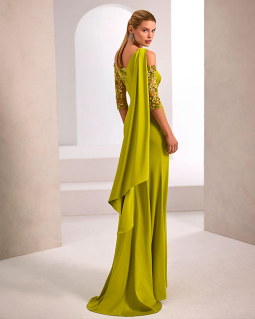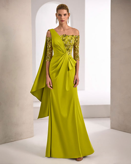 Vestido de fiesta largo, confeccionado en crepé satinado. Escote asimétrico, manga francesa y encaje en cuerpo.