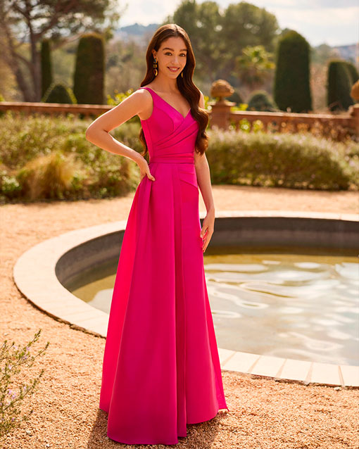 Vestido de fiesta largo. Confeccionado en mikado satinado. Escote pico y espalda escotada. Incluye chal de tul.