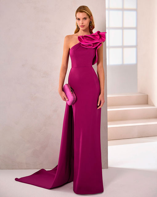 Vestido de fiesta largo. Confeccionado en mikado satén. Escote asimétrico con volantes. Incluye chal.