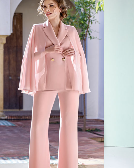 Traje de pantalón en crep con capa en gasa , la espalda de la americana tiene un escote que se cubre con la capa para dar originalidad.