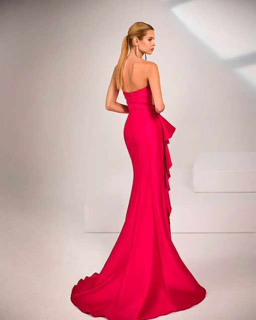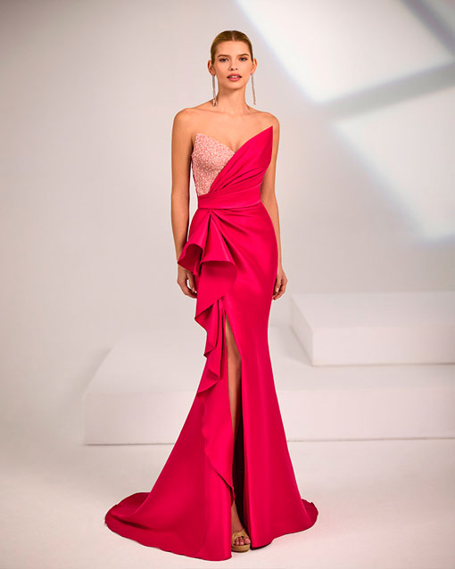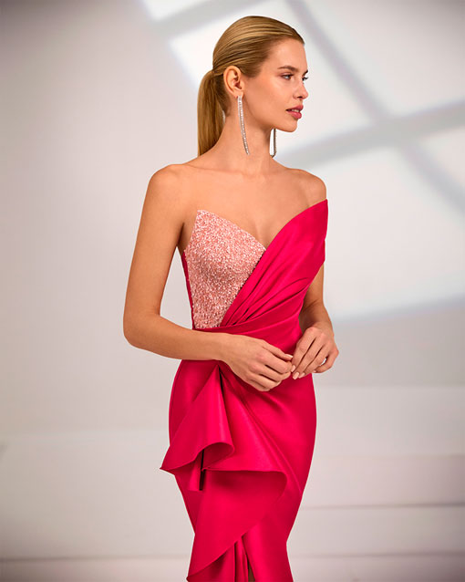 Vestido de fiesta largo. Confeccionado en mikado. Escote corazón. Detalles de pedrería.
