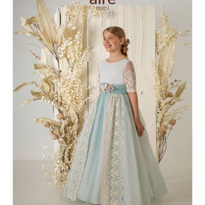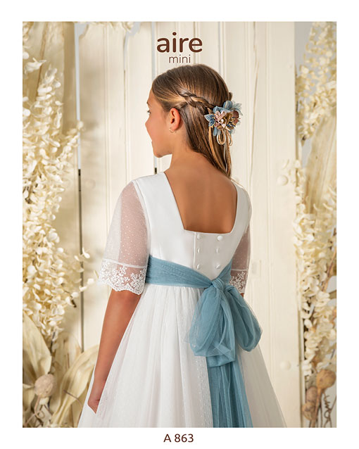 Vestido de comunión largo, de estilo romántico. Confeccionado en tul topos con fajín y flor de adorno. Presenta escote cuadrado, manga francesa y espalda cuadrada.