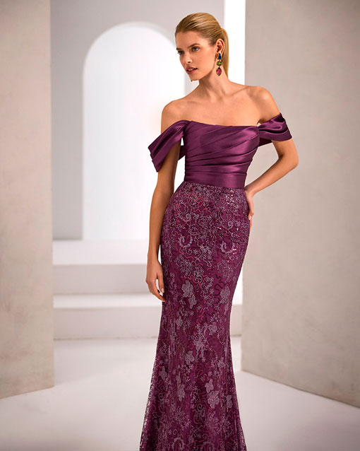 Vestido de fiesta largo dos piezas, confeccionado en tul bordado con pedreria, con escote palabra de honor y tirantes caidos, sobrefalda y chal.