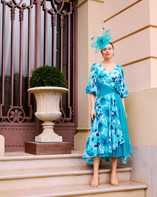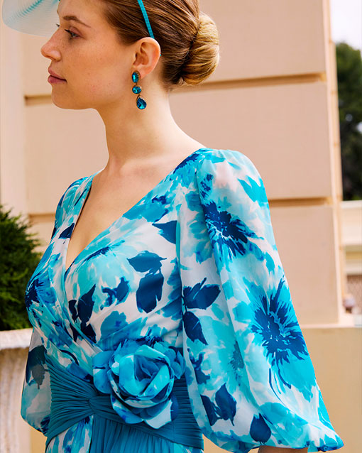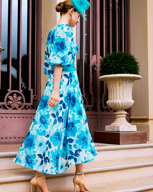 Vestido de fiesta midi, confeccionado en gasa estampada en color azul tiffany. Con escote en V, manga abullonada y espalda cerrada.