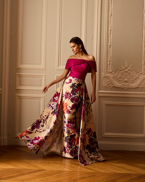 Vestido realizado en mikado con escote barco y cuerpo tableado, su falda estampada con cola preciosa que nace desde la cintura tableada, le da un aire muy elegante y diferente.