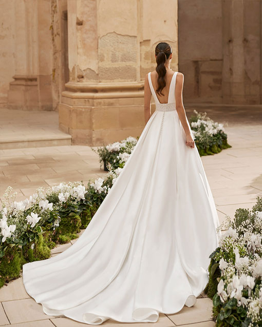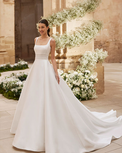 Vestido de novia, de corte volumen. Confeccionado en sienna. Escote cuadrado, tirantes y espalda escotada.
