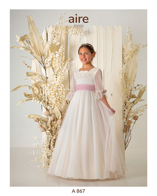 Vestido de comunión largo, de estilo romántico. Confeccionado en tul bordado con fajín y flor de adorno. Escote cuadrado, manga francesa y espalda en V.