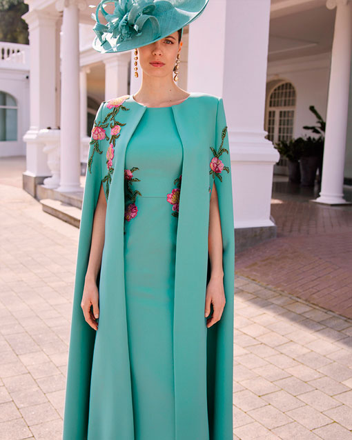 Vestido de fiesta midi, dos piezas confeccionado en crepé elástico. Con escote barco, manga corta y espalda cerrada con abrigo.