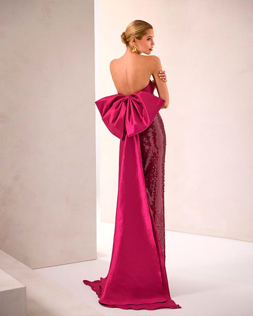 Vestido de fiesta largo. Confeccionado en lentejuelas. Escote palabra de honor de tafetán. Lazo en la espalda. Incluye chal.
