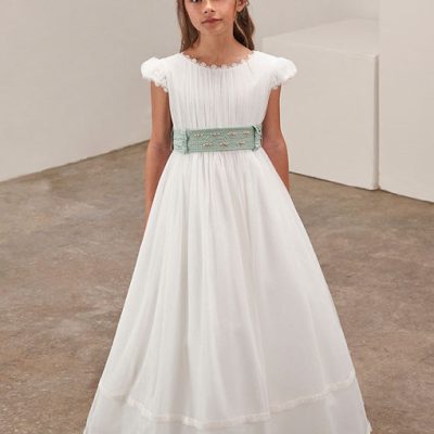 Vestido de corte alto, con cuerpo en nido de abeja, manguita corta.